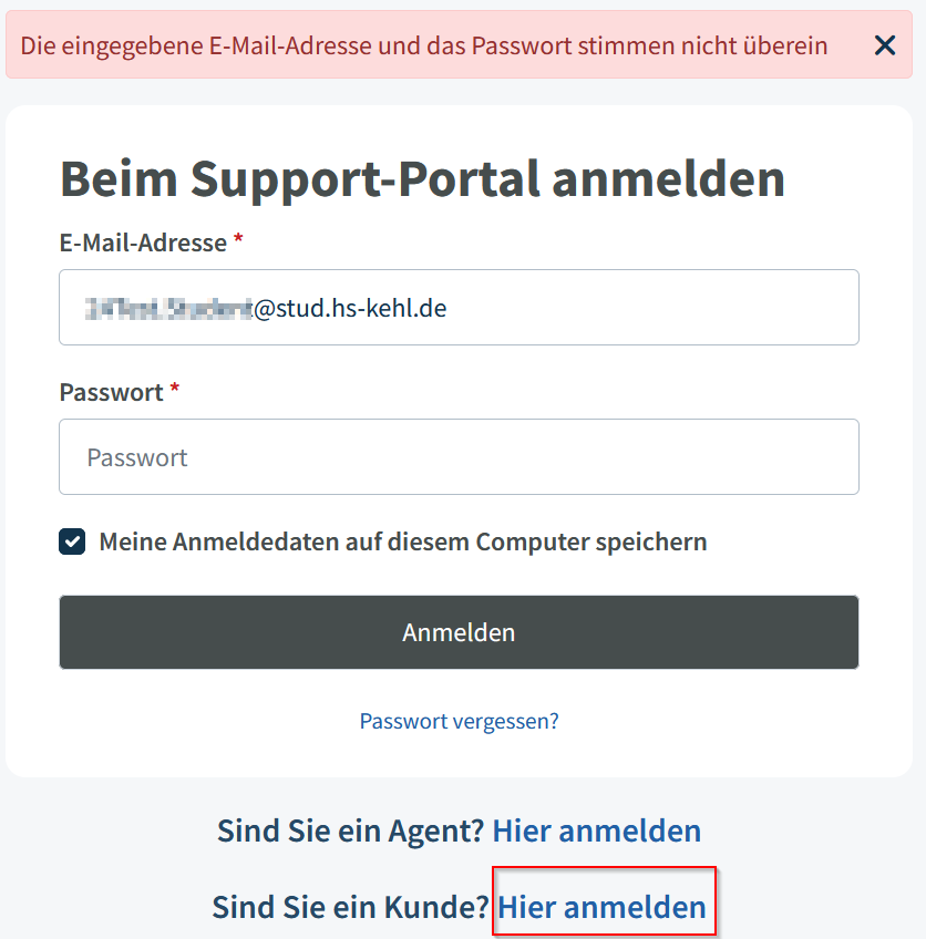 Sie Melden sich vermutlich im oberen Feld "Beim Support-Portal anmelden" an -> Die korrekte Anmeldemaske befindet sich weiter unten, bitte klicken Sie bei "Sind Sie ein Kunde?" auf "Hier anmelden"